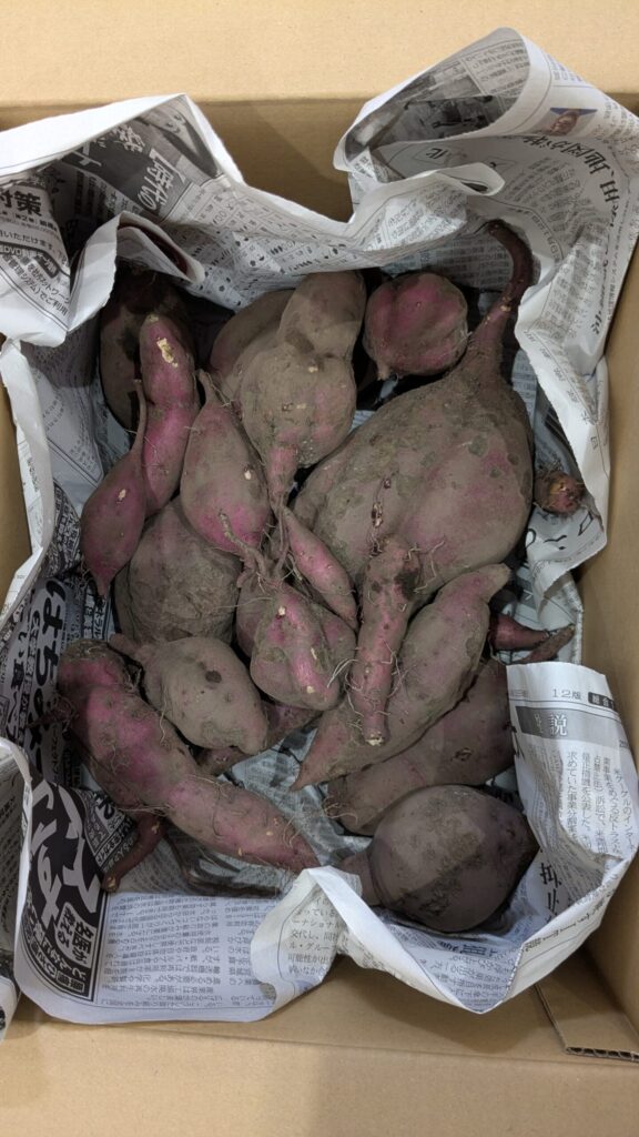 朝晩が寒く待ってきて、霜が降りそうになってきましたので、先日の3連休にサツマイモを収穫しました。今年は猛暑のせいか、猛暑で雑草取りをさぼったせいか、成長の勢いがいまいちでした。それで収穫量は下の写真のような状況で、いつもの1/3ぐらいでした。この段ボールに入れた状態でベランダに置いて、2周間くらい追熟させます。