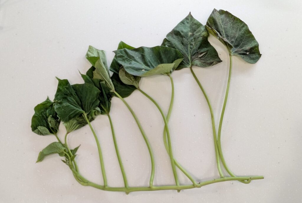 成長の勢いが良い時は、芋がらが太く、周りを一皮剥かないと、固くて食べづらいのですが、今年の芋がらは全体的に細く、一皮剥こうとしても爪が引っかかりませんでした。筋っぽくないかなあと心配しましたが、茹でて食べてみると十分に柔らかく、問題ありませんでした。茹でただけでもほんのりとサツマイモの甘みが感じられ、美味しいです。