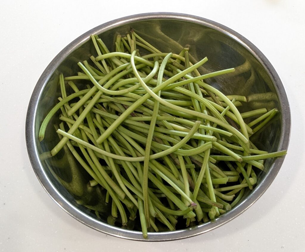 芋だけでなく、若葉や芋がらも食べられるのは、家庭菜園ならではの楽しみです。今は”楽しみ”ということになりますが、サツマイモは江戸時代の飢饉を救った食べ物と言われています。芋はもちろん、それを育てる過程や収穫後に葉や芋がらも食べることができる、本当にありがたいものだったのだと思います。飢饉であれば、全ての芋がらを取り込むところですが、さすがにそんなにたくさんは飽きてしまうので、今回はボール一杯分、約160本を収穫しました。