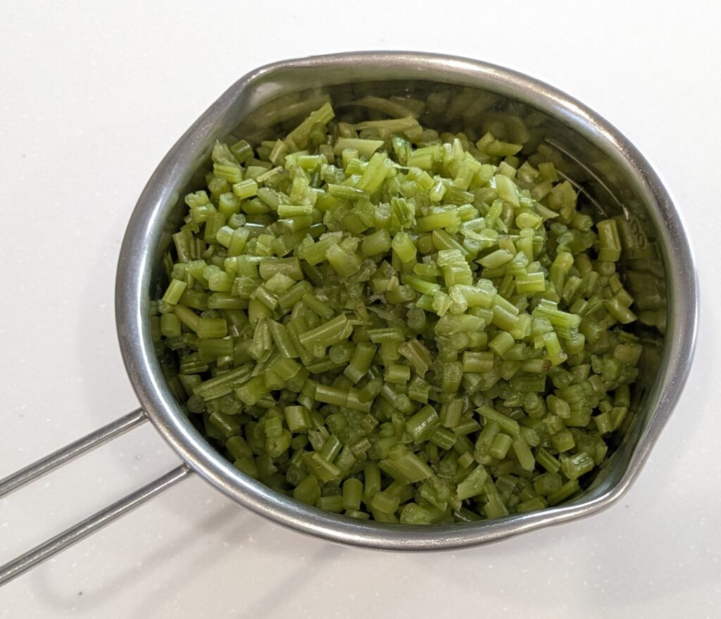 収穫した芋がらは洗い、沸騰したお湯に入れて約10分くらい茹でてから、5〜10mmの小口切りにしました。ボール一杯は隙間だらけの状態で、こうやって小口切りにすると、500mlのボールに1杯分になりました。