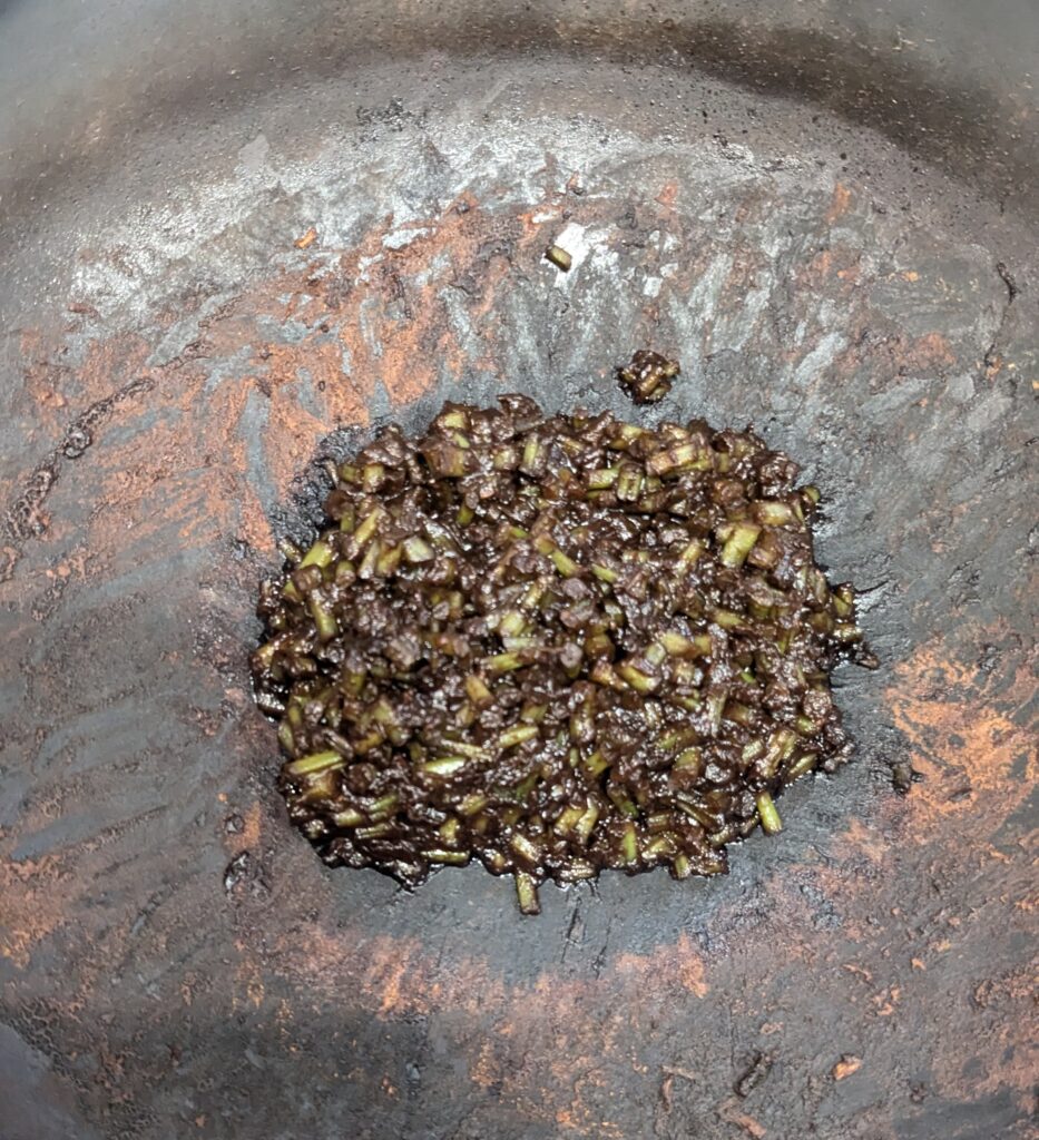 小口切りにした芋がらを中華鍋に入れ、お酒を大さじ1、みりんを大さじ1、味噌を大さじ2、これらがしっかり絡むように水(大さじ1〜2)で調整し、水分がなくなるまでかき混ぜれば完成です。