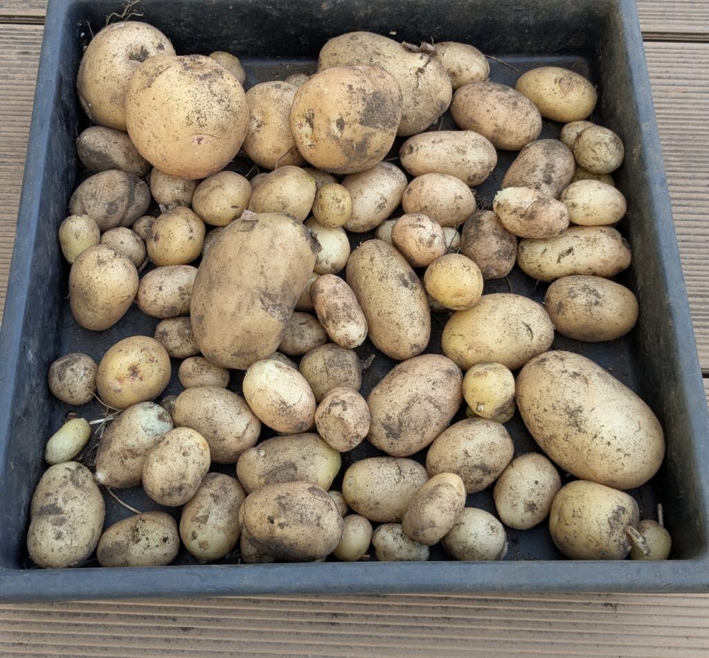 生命力の強さで驚いた話をもう一つ、下の写真のように、ジャガイモがたくさん収穫できたことです。6月にジャガイモを収穫した時に、一部、取りこぼしがあって、それが種イモとなって成長したのです。私の住む地域はジャガイモの二期作に適する地域ではないのですが、今年は残暑が厳しく、秋もそれなりに気温が高かったので、それなりの大きさのものもできたのだと思います。