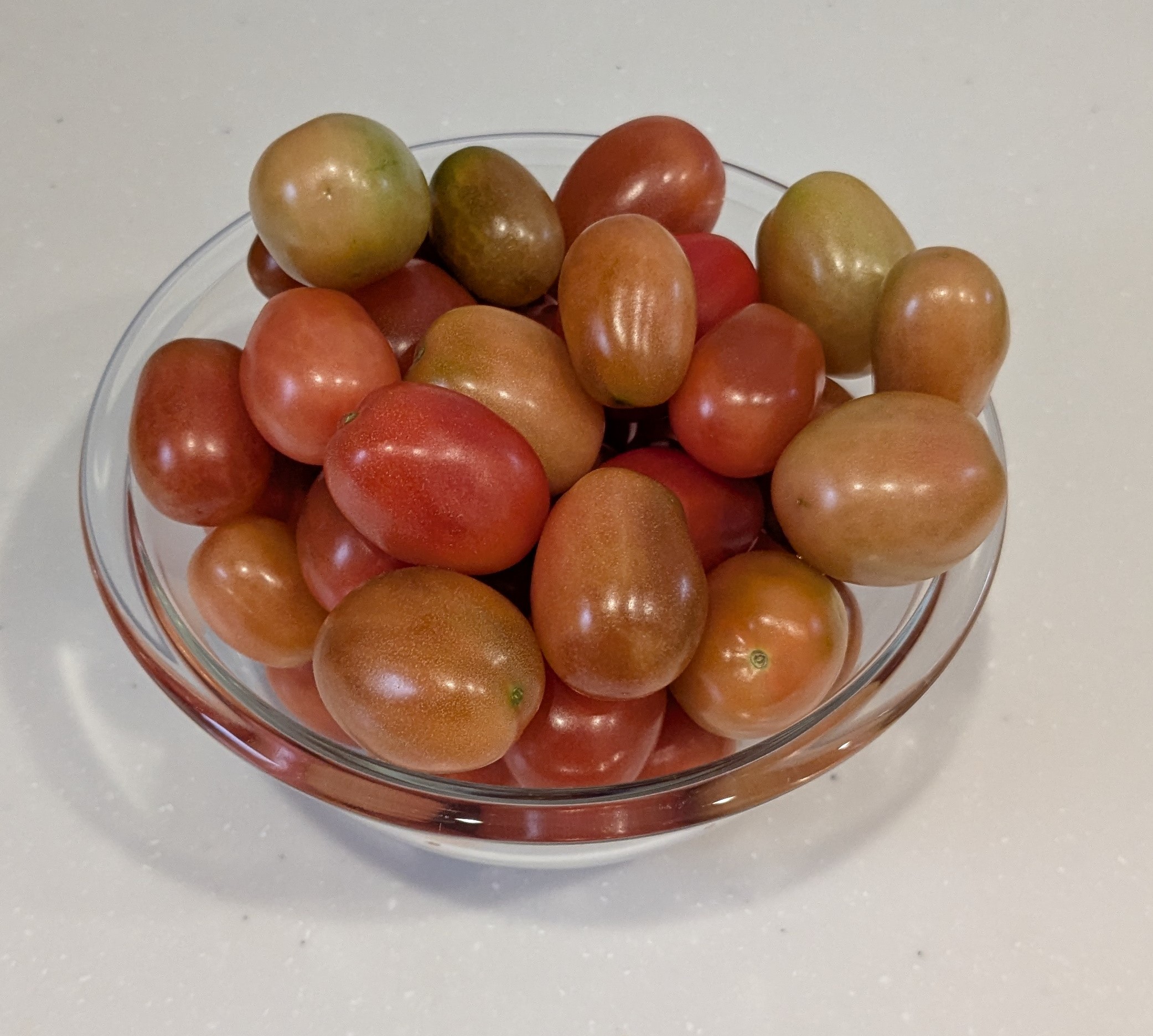 冒頭の写真のように、きれいな赤色に色づいているものもありますが、オレンジ色だったり、少し黄緑がかったものもあります。これぐらいであれば、それなりに美味しくいただくことができます。ですが、収穫した大部分は、下の写真のようにまだ黄緑色だったり、緑の濃いものです。これらは今食べるとアクが強く、美味しくないです。